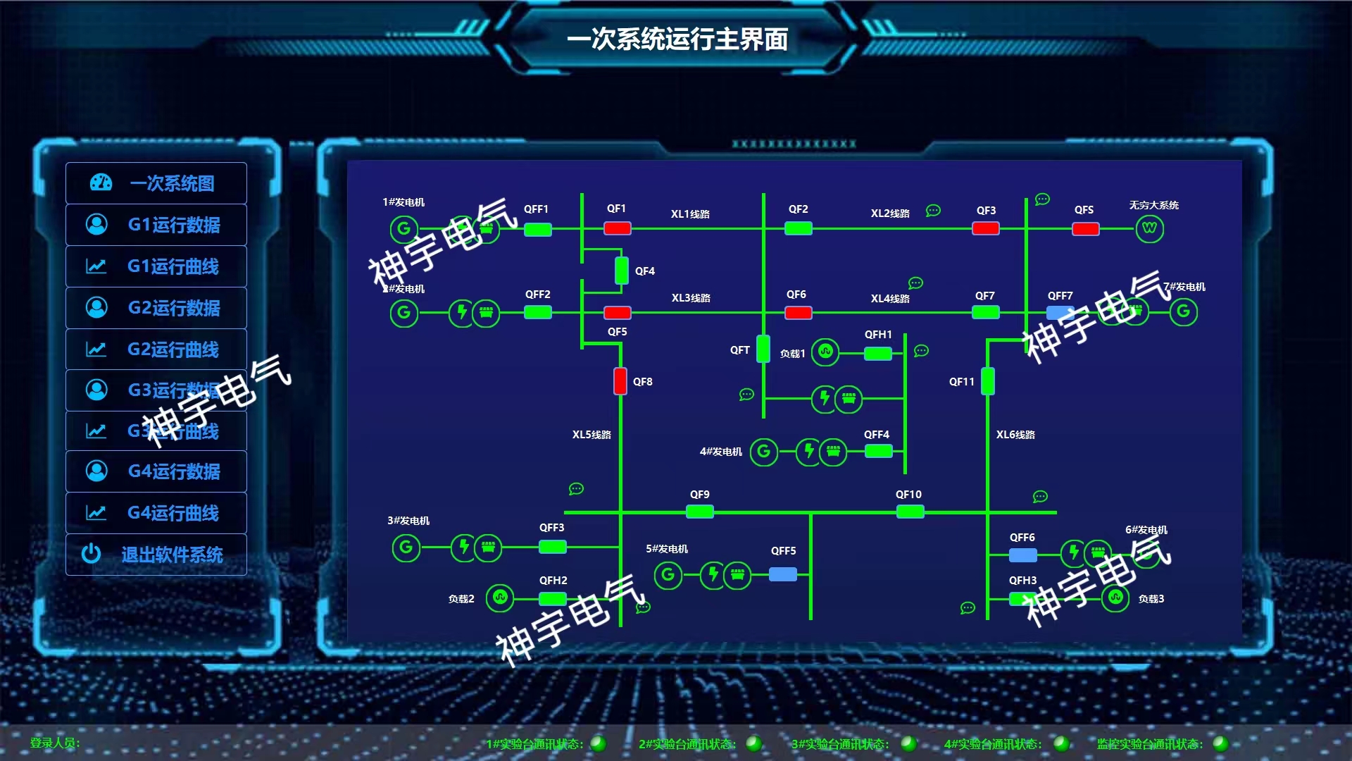 1.2整個監(jiān)控一次系統(tǒng)可構成一個可變的多機環(huán)型電力網(wǎng)絡,便于進行理論計算和實驗分析;每條輸電線路和負荷都配有微機型標準電力監(jiān)測儀,可以顯示各支路的電流、電壓、有功功率、無功功率、功率因數(shù)共計二十幾多個電量,并且都通過RS-485通訊口與上微機相聯(lián),實時顯示電力系統(tǒng)的運行狀況,以及各開關的動作情況。同步監(jiān)視電力網(wǎng)絡的潮流分布和進行多機電力系統(tǒng)的潮流計算及保存歷史數(shù)據(jù),繪制歷史曲線,具有“遙測”、“遙信”、“遙調”、“遙控”四遙等功能。